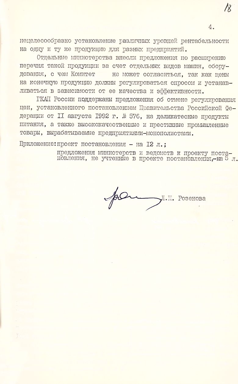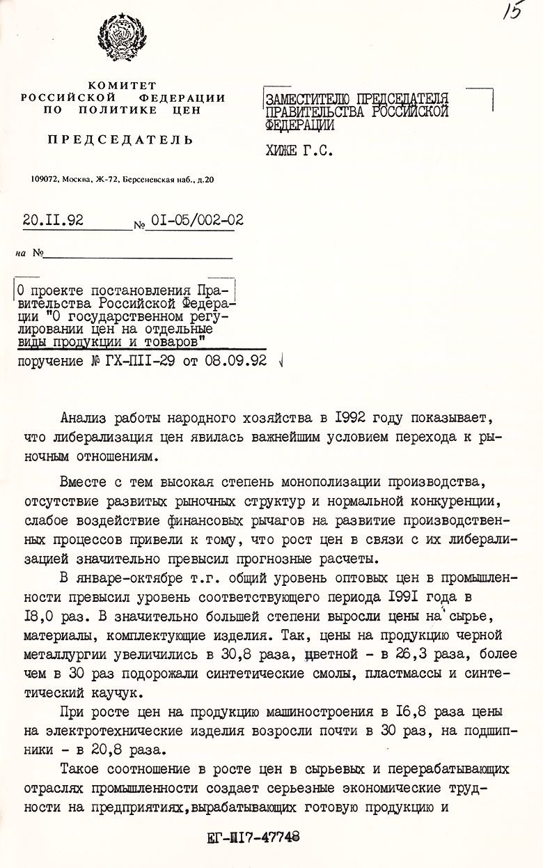 Докладная записка председателя Комитета Российской Федерации по политике цен Л. И. Розенова заместителю председателя Правительства Российской Федерации Г. С. Хиже о проекте постановления Правительства «О государственном регулировании цен на отдельные виды продукции и товаров». 20 ноября 1992
