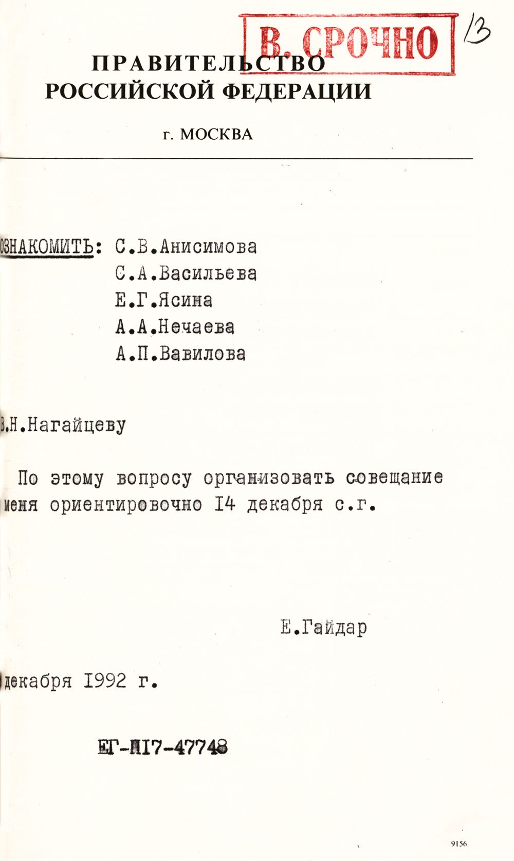 Записка Е. Т. Гайдара об обсуждении проекта постановления Правительства РФ «О государственном регулировании цен на отдельные виды продукции и товаров». Ранее 14 декабря 1992