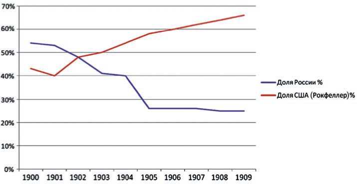 На тот момент в России (Баку – Батум) добывалось и перерабатывалось 11,2 млн тонн нефти, что составляло 53 % мировой нефтедобычи. Великий Рокфеллер контролировал лишь 40 % мировой нефтедобычи и переработки.