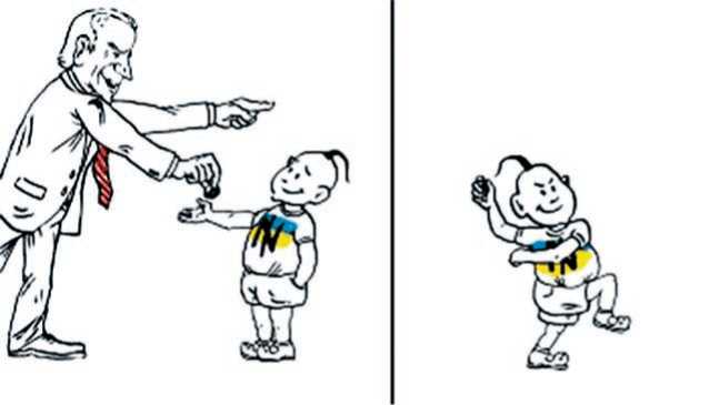 В данном случае вместо подростка выступает Россия (Путин), вместо «младшего брата» – действительно «мелкий» и шумный клоун Зеленский, представляющий псевдогосударство Украину, а вместо «старшего брата» – англосаксонская финансовая олигархия, использующая в качестве главных инструментов объединенную прессу и объединенную Европу.
