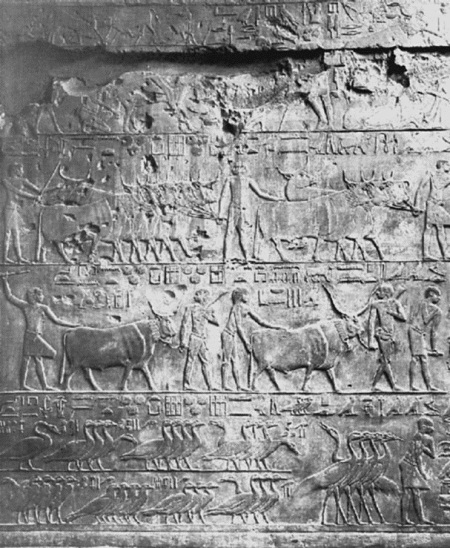 В 1865 году Мариетт открыл гробницу сановника Ти, который был крупным землевладельцем и, как гласят тексты, «начальником всех царских работ, руководителем строительства пирамид и охранителем вечных мест». Эта самая красивая и лучше всех сохранившаяся из саккарских гробниц была построена около 2600 года до н. э. – в те времена, когда цари Хеопс, Хефрен и Микерин сооружали свои пирамиды. Стены гробницы покрывали великолепные многоцветные рельефы, своим тончайшим рисунком производившие впечатление настенной живописи. Они изображали и самого сановника Ти, фигура которого всегда втрое, а то и вчетверо крупнее, чем фигуры людей более низкого звания, и картины повседневной жизни той эпохи: ремесленников, писарей, рисовальщиков, земледельцев, охоту на бегемотов, рыбную ловлю, забой домашнего скота и выделку кож, сбор податей и наказание недоимщиков, – короче говоря, всю панораму повседневной жизни Древнего Египта. Эти изображения настолько реалистичны, что позволили установить, какими орудиями и инструментами пользовались тогдашние земледельцы и ремесленники, какие приемы они применяли. Ни одно из ранее открытых захоронений не давало такого реального представления о жизни древних египтян, как эта гробница.