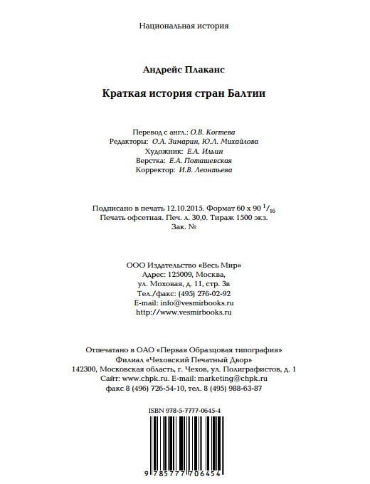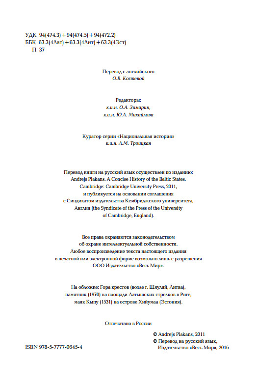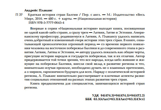 Общая история трех балтийских стран, написанная профессором Андрейсом Плакансом, является органичной частью серии «Национальная история», которую издательство «Весь Мир» выпускает начиная с 2002 года. И хотя эта книга имеет два существенных отличия от других изданий серии, мы считаем, что в проекте она занимает свое место по праву. О каких отличиях идет речь? Во-первых, эта первая книга в рамках серии, которая посвящена не какой-либо одной стране, а сразу трем. Во-вторых, автор книги – этнический латыш, родившийся в Латвии, но с раннего детства живущий в США, и как ученый-историк, он принадлежит к американской исторической школе и пишет по-английски. Авторы других книг, опубликованных нами ранее в рамках серии, были «местными» историками, живущими и работающими в той стране, историю которой они написали. Конечно, мы могли опубликовать эту книгу отдельно, вне проекта «Национальная история», и тогда никакие объяснения не понадобилось бы. И все же мы поступили иначе.