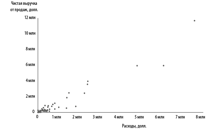 На диаграмме отмечены книги (по просьбе издательства я не указываю их названия), выпущенные Grand Central осенью 2006 г., – всего 61 издание в переплете, а также представлена информация по расходам (приобретение прав, редакционная подготовка, производство и маркетинг) и по чистой выручке от продаж. Самая дорогая книга, стоящая в плане, обошлась более чем в 7,5 млн долл., а чистая выручка от ее продажи составила 11,6 млн долл.{42}42