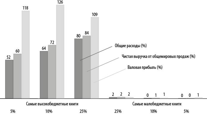 На диаграмме представлены сгруппированные по бюджетам книги, выпущенные Grand Central осенью 2006 г., – все издания в переплете; показано, как среди этих групп распределяются следующие показатели: общие расходы, чистая выручка от общемировых продаж, валовая прибыль. Например, на 5 % самых высокобюджетных книг приходится немногим более половины общих расходов (затраты на приобретение прав, редакционную подготовку, производство, маркетинг и т. д.), 60 % чистой выручки и 118 % валовой прибыли{44}44