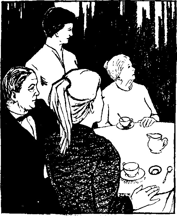 «Этот тоже вполне «оригинальный» портрет домашней галереи!» – иронически думал Петя, временами поднимая взгляд в сторону дяди Жана. Иван Семенович сидел напротив, возвышаясь над столом ширококостным тяжелым корпусом, словно массивная фигура, снятая с цоколя и одетая в черный костюм в полоску. Лицо дяди Жана, тоже как бы окаменевшее, с мясистыми тугими щеками и крупным ртом, еще хранило следы недавнего спора с тетей Верой. Его заплывшие сизые глазки, скошенные в сторону младшей сестры, казалось, готовы были пронзить ее своим колючим взглядом. Молодая жена дяди Жана, особа лет тридцати с мучнисто-бледным пухленьким лицом, выщипанными бровками и пышным белокурым хвостом на затылке, сидела рядом с супругом и вяло пила чай с ватрушкой, держа чашку на уровне своих накрашенных губ.