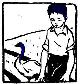 Гуска жил в сером сарайчике позади столовой, в живом уголке. Когда Костя открыл скрипучую дверцу, животные, тихо сидевшие в полумраке, зашевелились. Белка прыгнула, зайчишка приставил к прутьям клетки свой раздвоенный нос и задвигал ноздрями. Гусь приподнялся на лапах, изогнул шею и, гоготнув, шагнул к Косте. Тот подвинул к нему миску с размоченным горохом и, пока гусь глотал, открыл клетку и взял на руки зайчишку. Сквозь пышную нежную шерстку Костя чувствовал горячую кожу и тонкие ребра зайчишки. Какой он хрупкий, тоненький. А сердце бьется часто-часто, прямо об Костину ладонь. Костя осторожно посадил зайчишку обратно в клетку, достал ему из ящика морковку, а белке положил шишку. Белка схватила шишку в лапки и принялась быстро-быстро лущить, только чешуйки полетели. Костя полюбовался ею немного, потом открыл дверцу сарайчика и сказал: «Пошли, Гуска!» Гусь, ворочая из стороны в сторону хвостом, охотно зашлепал следом.