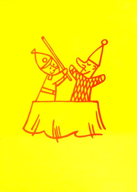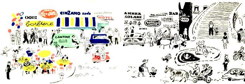 Синьор Амедео хватает клетчатую скатерть и начинает «накрывать на стол» на своём прилавке. Он хлопотливо разглаживает складки на скатерти, раскидывает салфетки то так, то эдак, отходит в сторону, любуется, потом перекладывает всё заново. «Ай-ай-ай, какие салфетки!» Потом срывается и бежит в лавочку напротив, где торгуют посудой, хватает пару чашек и ставит их на скатерть! Но прохожие качают головой – им не нужны скатерти. Тогда Амедео кричит: «Моменто!» – возвращает чашки и бежит обратно. Конечно! Разве эта скатерть – то, что нужно синьору и синьорине? Где у него была голова, когда он предлагал этот товар таким покупателям? Он хватает скатерть и салфетки, связывает их в узел и швыряет на пол. Красная скатерть! Красные с синим салфетки! Вот, что достойно покупателей! Амедео машет скатертью, как флагом, складывает салфетки веером и обмахивается, словно жеманная синьорина. Наконец он вскакивает на прилавок, накидывает на себя красную скатерть, как королевскую мантию, и простирает руку к небу. Белые волосы развеваются, сверкают чёрные глаза, а чёрная борода отливает синим. Тонио смотрит, смотрит, это ещё интереснее, чем кино. Покупатели не выдерживают и раскрывают кошельки. Красиво торгует синьор Амедео, Тонио хотел бы так торговать! Только вот что – у Тонио нет чёрной бороды и потом – товары! Где берутся товары? Мама приносит их со склада. А что такое склад, и как получить там товары? Но ведь не все же торгуют? Вот сидит на ступеньках дядя Карло. Его большой живот набит, как барабан, лицо масляное, глаз почти не видно. Дядя Карло ковыряет в зубах и напевает без слов: «Ни-на-на-на-на».