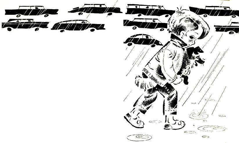 Здесь ходили незнакомые люди, мчались автомобили. Одни мчались, а другие стояли, въехав на тротуар. Вот к тёмно-красному автомобилю подходит мужчина в новом серебристом костюме, приглаженные волосы блестят. И тут, откуда ни возьмись, выскакивает мальчишка с тряпкой и ну протирать стёкла! И протирает, и протирает, а этот красивый человек стоит и ждёт и вертит на пальце колечко с ключами. Наконец мальчишка всё протёр и подошёл к нему. Хозяин машины бросил мальчишке монету, сел в машину, она сползла с тротуара и уехала, а мальчишка убежал.