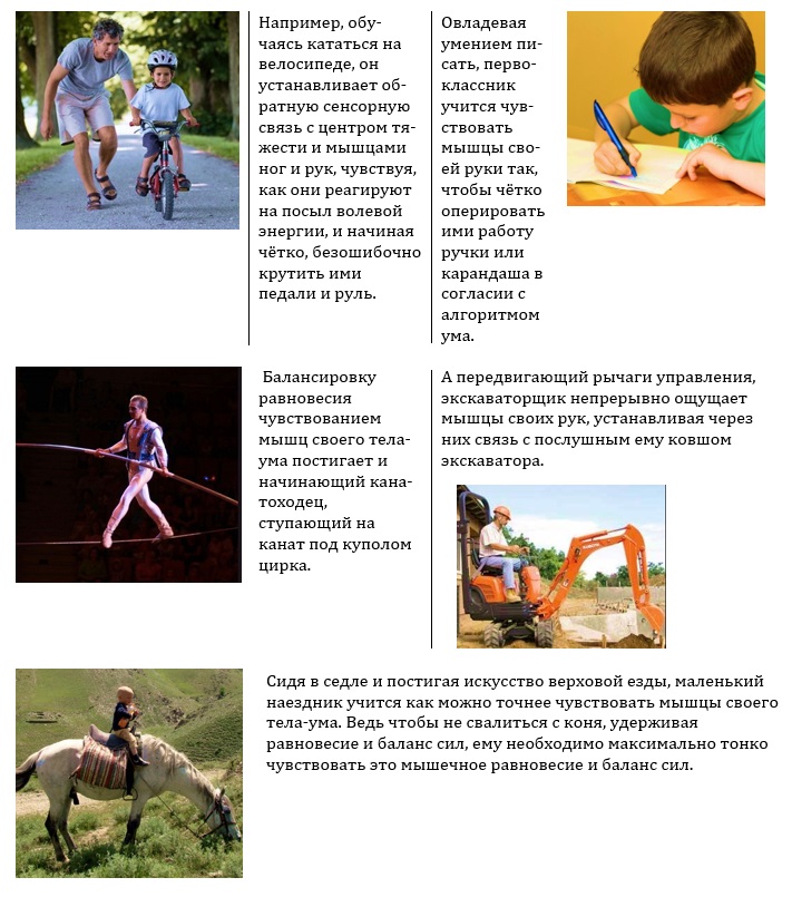Причём, это касается не только таких неодушевлённых предметов, как музыкальный инструмент, карандаш, вязальный крючок или теннисная ракетка, которыми мы учимся оперировать. Это так же и прежде всего касается частей нашего собственного тела, баланс сил и масс которого мы выучиваем, чтобы резонировать разные действия на протяжении нашей жизни: ходить, держать ложку, свистеть, отбивать чечётку, жестикулировать руками, говорить языком на потоке воздуха и т.п. Ведь чтобы выполнять легко и качественно какое-либо действие, человеку необходимо довести до высокого мастерства собственную способность сенсорить, мерить и балансировать массы, силы и степень раздражения, чувствуя обратную связь с каждым предметом и каждой частью своего тела и мыслью, отвечающей за выполнение этого действия-резонанса.