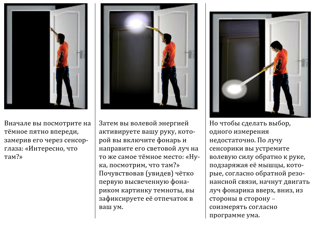 Отрезонируйте в уме, представив себе, что вы находитесь у открытой двери в незнакомую тёмную комнату, в которую вы собираетесь войти. Для того, чтобы решить, куда шагнуть в кромешной тьме (пустоте), вам необходимо собрать информацию вашим лучом сенсорики и послать её на обработку (хранение и сравнение) в ваш ум.