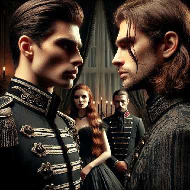 Его фигура, одетая в элегантную темную одежду, притягивает взгляды как магнит. Он стоит в окружении своих советников, с верным Вэрэлом, который обвил его руку.