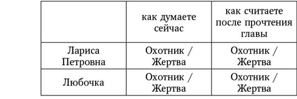 Как думаете, кто из них Охотник, а кто Жертва? Отметьте, к какому выводу вы пришли сейчас, а немного позже, когда мы с вами разберемся, по каким критериям определяются эти жизненные позиции, вы вернетесь к своему ответу и проверите, насколько правильно вы видели ситуацию.