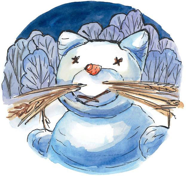 Основание снеговика – огромный шар – установили в самом центре двора. Следом за ним семья скатала второй шар – поменьше, и третий – совсем небольшой. Они взгромоздили их друг на друга и принялись украшать снеговика. Пуша слепила два симпатичных кошачьих ушка и поместила их по обеим сторонам головы. Из двух угольков котята сделали глазки, из розовой морковки – маленький аккуратный носик. Надо ртом Барсик приладил усы из сена, а над глазками-угольками – длинные ресницы, тоже из сена. Вместо рук снеговику сделали лапки. Когда работа была закончена, котики взглянули на своё творение и развели лапами. Из-под длинных ресниц на них весело смотрел вовсе не снеговик.
