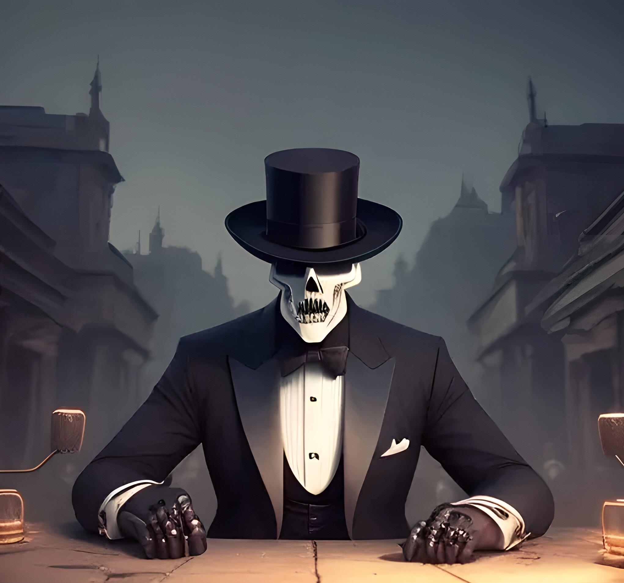 Эта фигура, словно тень, подплыла к нему, и стояла уже в нескольких метрах. Это был высокий мужчина в черном костюме, под которым была золотистая рубашка. На лице белая маска черепа, а на голове черный цилиндр. Этот мужчина в левой руке держал трость, на которую опирался.