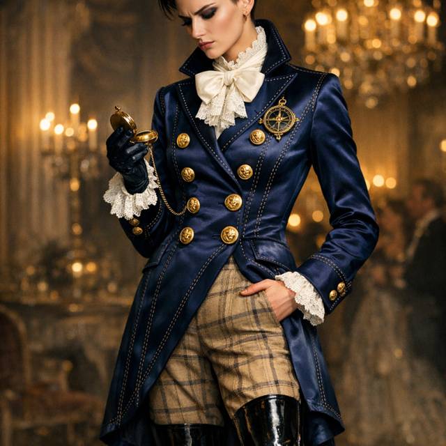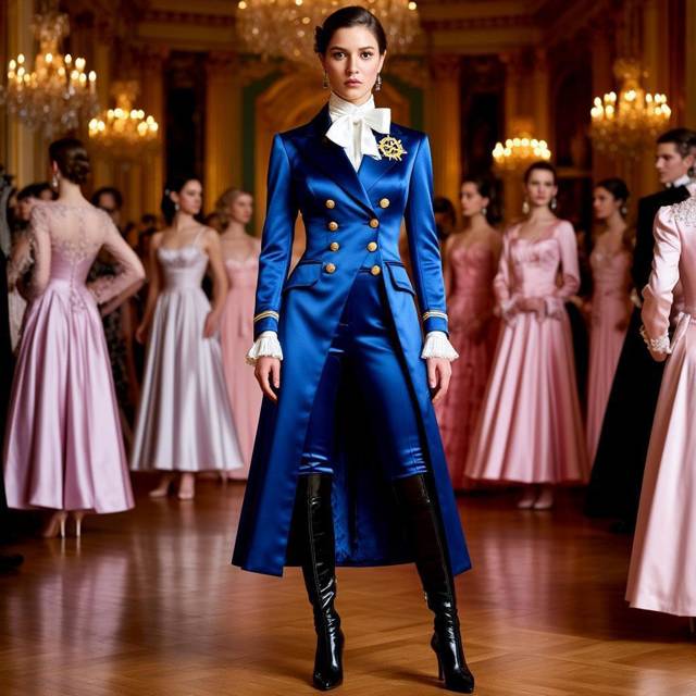 Синий мужской сюртук – отсылка к морю и серьёзным делам. Белый бант – открытость, чистота помыслов и приглашение. Золото пуговиц – заявление о богатстве и надёжности. Чёрные ботфорты – уверенность и деловитость. Бежевый цвет брюк и перекликающаяся строчка на атласе – готовность к уступкам и переговорам.
