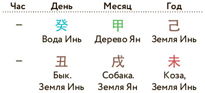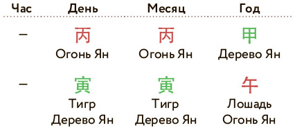 Карта бацзы читается справа налево. Столпы от года до часа показывают последовательно появляющиеся в жизни человека людей и сферы.