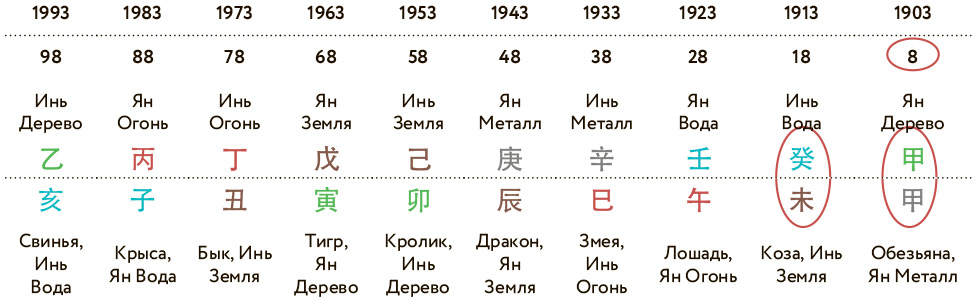 Таким образом, мы имеем возможность определить, на какую из сфер жизни будет у человека фокус в определенный период времени, какие энергии будут преобладать у него в это время. Вы можете заметить, что базовая карта содержит всего восемь иероглифов, а значит, по этому расчету мы можем характеризовать возраст до 64 лет. Продолжительность жизни – история совершенно индивидуальная, поэтому стоит исходить из того, что первые два столпа – это условная первая половина жизни, а вторые два столпа – жизнь во второй половине, опять же условной. Ниже мы будем говорить и о десятилетних периодах удачи: когда мы их строим, то планируем для анализируемой карты десять десятилеток, сто лет, оптимистично полагая, что этого точно будет достаточно для полного анализа.