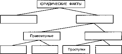 2. По волевому признаку – делятся на события и действия: правомерные (юридические акты и юридические поступки) и неправомерные (проступки и преступления).