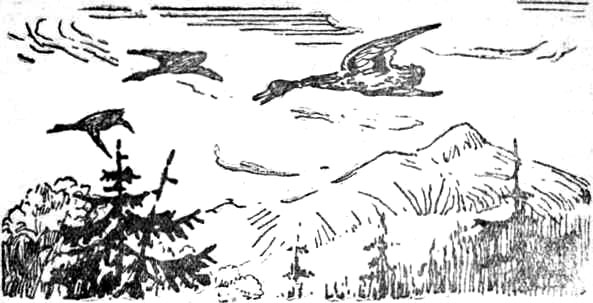 Разбудили его какие-то звуки. Долина уже вся погрузилась в тень, только вершины гор освещались солнцем. Низко над землёй, тонко посвистывая крыльями, летели большие рыжие птицы с белой головой и с белыми пятнами на крыльях.
