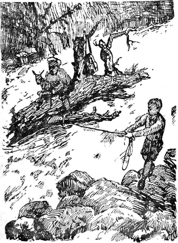 Веревка вырвалась у него из рук. Он забежал в воду и, два раза обернув веревку вокруг пояса, завязал ее узлом. Затем встал на четвереньки. Веревка натянулась и потащила Шуру глубже в воду, но он схватился руками за выступивший из воды камень. Дерево остановилось. Шура пополз вокруг камня, чтобы закрутить за него веревку. Веревка трещала. Шура боялся, что вот-вот она оборвется и тогда всё пропало. Но тонкий конец сосны приблизился к берегу, и Шура увидел, что Лёня, положив козлёнка себе на шею, ползет по стволу. Через минуту он был на берегу. Шура облегченно вздохнул. Теперь на сосне осталась только сумка с камнями и золотом. Через минуту дерево совсем прибило к берегу. Лёня снял сумку и топором перерубил веревку. Дерево сначала медленно двинулось вдоль берега, потом перевернулось, закружилось, выплыло на середину и понеслось, ныряя в пенистых волнах.
