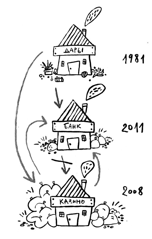 Мы подошли к магазину «Дары полей». Сейчас у нас там банк «УралСибСтройПромСвязьНефть» открыли, а раньше было казино «Золото партии».