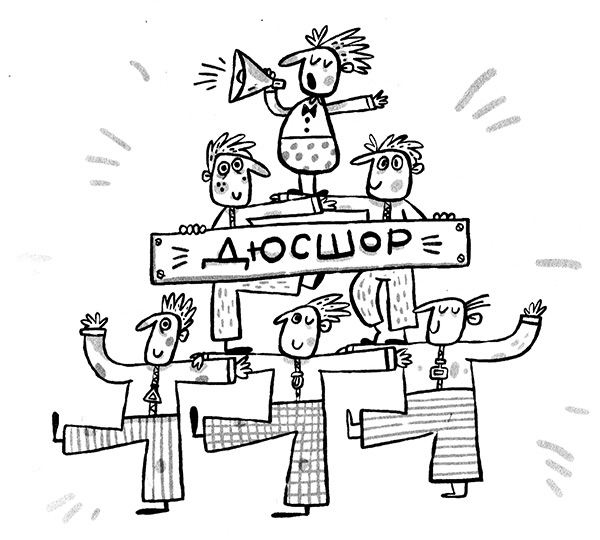 Мимо нас прошла колонна каких-то атлетов в чёрных трико. Одни атлеты шагали под Иосифа Кобзона из громкоговорителей, а другие стояли у них на плечах и держали транспарант: «Детско-юношеская спортивная школа олимпийского резерва (ДЮСШОР)». Эту сложную конструкцию венчал атлет небольшого роста с мегафоном на верёвочке.