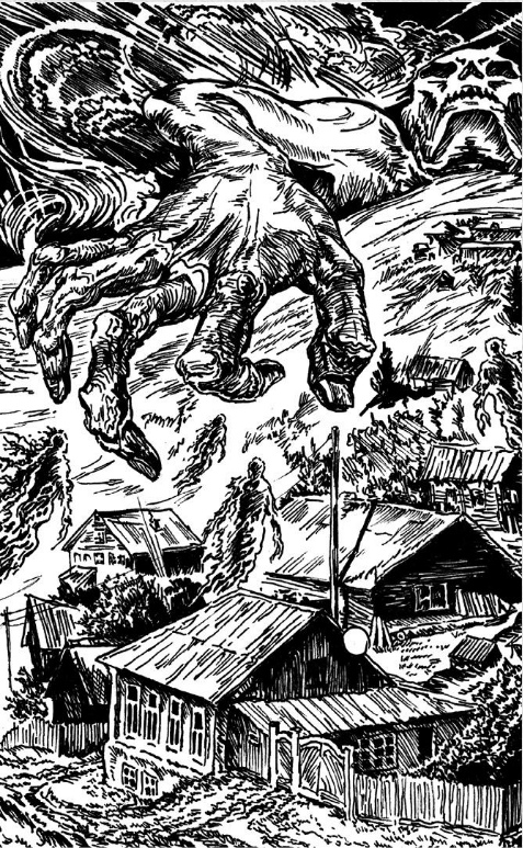 «Так пришло и Оно!» – понял сумраковский сторож. И Оно пустило дрожь по его телу, подтверждая догадку. А потом, высоко за сумраковскими домами, Андрей увидел нечто. Сначала ему показалось, что это туча, грозовой фронт или что-то вроде этого, но присмотревшись, он различил огромную руку, что тянулась от вершины оврага к речке. И рука эта была так велика и так черна, что на ее изгибе можно было бы выстроить дом, а в складках кожи – посадить огород. Пальцы напоминали растопыренные обнаженные корни вывернутого из земли старого дуба. Рука росла из плеча, которое торчало из склона чуть выше; шеи не было видно. Зато дальше можно было разглядеть голову – точнее, низкий лоб и сжатые веки. Остальная часть гигантского лица все еще оставалась под землей.