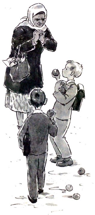 А мы догнали старушку, отдаём ей яблоки. Она нам и говорит: