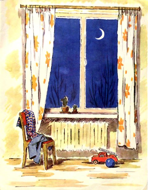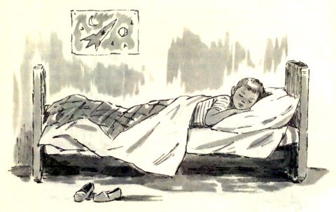 Я хотел маму разбудить, да побоялся, что она рассердится. И вдруг по небу самолёт пролетел, три звёздочки проплыли: две зелёные и одна красная. Значит, лётчик тоже не спит. И сразу стало ничего не страшно. Я как следует накрылся одеялом, полежал, полежал и заснул.