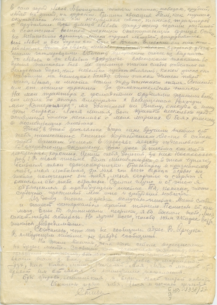 Город Львов явил для меня тяжелую картину войны. Перед въездом во Львов, на его окраине я увидел впервые такой гигантский концлагерь для рабов у фрицев. Бараки бесконечными вереницами за густой стеной из колючей проволоки. По углам лагеря дзоты с амбразурами для пулеметов. В этом лагере какой-то Курц Зелингер организовал производство глиняных водопроводных труб. Штабеля готовой продукции сверкают обожженным глянцем на солнце. Мы въезжаем в сам город Львов. Движутся тысячи машин, повозок, орудий, людей на запад, на фронт. Гремит авиация. Пыль, как туман, окутывает нас от несущихся авто, танков, тракторов с орудиями. Все улицы Львова загружены горами разбитой и сожженой военной техники отступающих фрицев. Особенно невыносимо зрелище массы трупов лошадей, запрудивших весь Львов и все дороги от Буга до Вислы. Зловоние от них непередаваемо. Дома во Львове многие разбиты, многие взорваны убегавшими гитлеровцами. Обочины прекрасного шоссе из Кирпича до Львова и за Львовом изрезаны советскими танками во время танковых боев. Их гусеницы таких следов наделали по сторонам дорог, что невольно представляешь, какой ужас они наводили на немецкие банды. Эти танки делает твой папа, Люся, и многие наши труженики тыла. Спасибо им от нашего фронта за замечательные танки. На мои трактора с громадными орудиями жители всегда от мала до стара смотрят с восхищением. Рокочут мои «Катерпиллеры», мы движемся на Вислу, откуда и пишу эти строки. Люся, милая, вот кратко несколько представлений далеко неполных о моих маршах. О боях расскажу в следующих письмах.