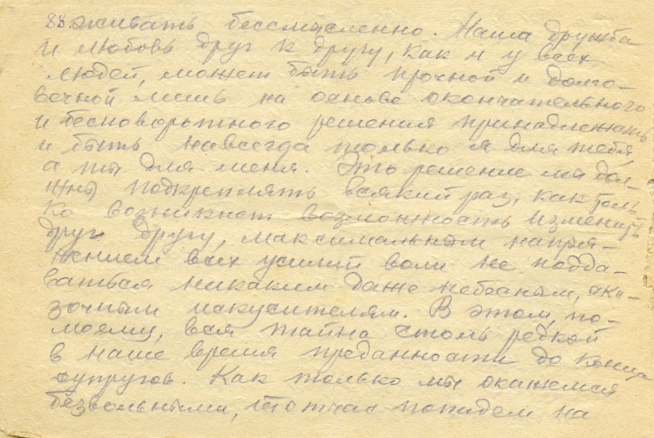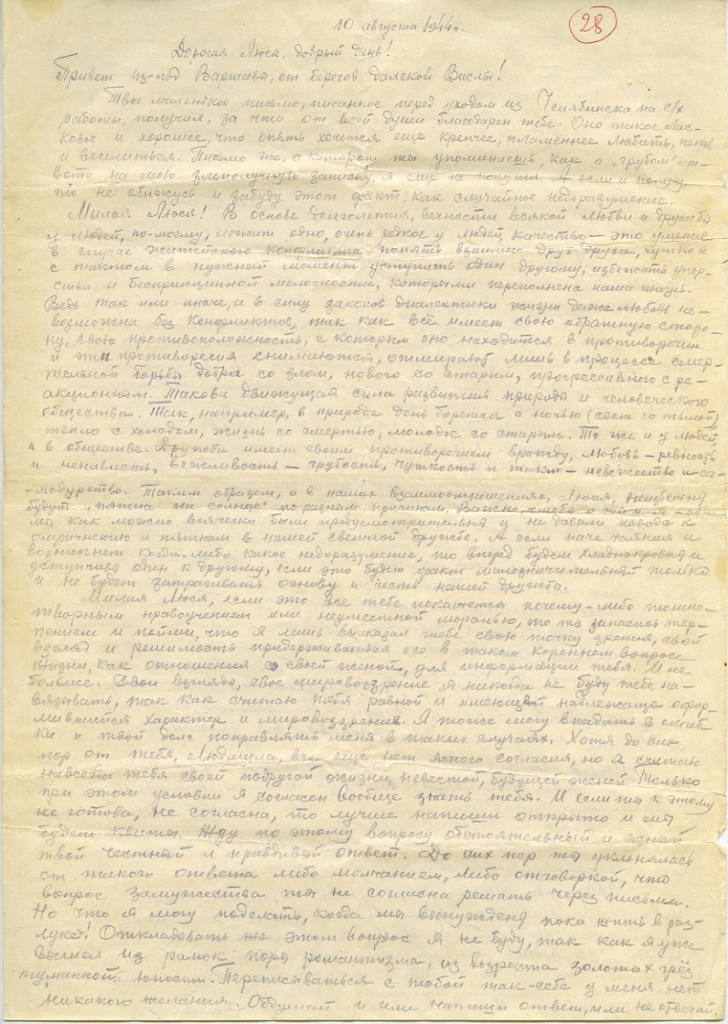 Милая Люся! В основе долголетия, вечности всякой любви и дружбы у людей, по-моему, лежит одно, очень редкое у людей качество – это умение в случае житейского конфликта понять взаимно друг друга, чутко и с тактом в нужный момент уступить один другому, избежать упорства и беспринципной мелочности, которыми переполнена наша жизнь. Ведь так или иначе, а в силу законов диалектики жизни, даже любовь невозможна без конфликтов, так как всё имеет свою обратную сторону, свою противоположность, с которым оно находится в противоречии. И эти противоречия снимаются, отмирают лишь в процессе смертельной борьбы добра со злом, нового со старым, прогрессивного с реакционным. Такова движущая сила развития природы и человеческого общества. Так, например, в природе день борется с ночью, свет со тьмой, тепло с холодом, жизнь со смертью, молодое со старым. То же и у людей, и в обществе. Дружба имеет своим противоречием вражду, любовь – ревность и ненависть, вежливость – грубость, чуткость и такт – невежество и самодурство. Таким образом, и в наших взаимоотношениях, Люся, неизбежно будут «пятна на солнце», по разным причинам. Важно, чтобы и ты, и я – оба мы как можно всячески были предусмотрительны и не давали повода к омрачению и пятнам в нашей светлой дружбе. А если и возникнет когда-либо какое недоразумение, то вперед будем хладнокровны и уступчивы один к другому, если это будет факт малозначительный только и не будет затрагивать основу и честь нашей дружбы.