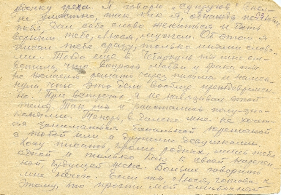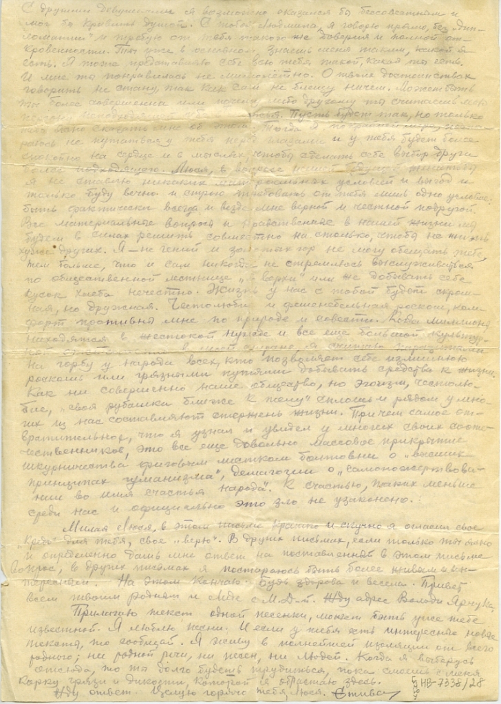 Милая Люся, если это всё тебе покажется почему-либо тошнотворным нравоучением или неуместной моралью, то ты запасись терпением и пойми, что я лишь высказал тебе свою точку зрения, свой взгляд и решимость придерживаться его в таком коренном вопросе жизни, как отношения со своей женой, для информации тебя. И не больше. Свои взгляды, своё мировоззрение я никогда не буду тебе навязывать, так как считаю тебя равной и имеющей надлежаще оформившийся характер и мировоззрение. Я тоже могу впадать в ошибки и твой долг поправлять меня в таких случаях. Хотя до сих пор от тебя, Людмила, все еще нет ясного согласия, но я считаю навсегда тебя своей подругой жизни, невестой, будущей женой. Только при этом условии я согласен вообще знать тебя. И если ты к этому не готова, не согласна, то лучше напиши открыто, и мы будем квиты. Жду по этому вопросу обстоятельный и ясный твой честный и правдивый ответ. До сих пор ты уклонялась от такого ответа либо молчанием, либо отговоркой, что вопрос замужества ты не согласна решать через письма. Но что я могу поделать, когда мы вынуждены пока жить в разлуке! Откладывать же этот вопрос я не буду, так как я уже вышел из рамок поры романтизма, из возраста золотых грез, туманной юности. Переписываться с тобой так – себе у меня нет никакого желания. Обдумай и или напиши ответ, или не отвечай.