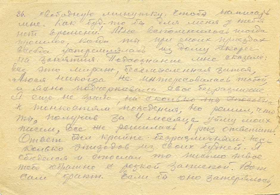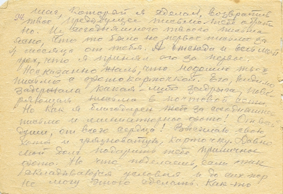 Здесь, в этой землянке вчера ещё мне вручили письмо от тебя, написанное спешно карандашом где-то в садике перед вашим домом в перерыве между подготовкой к очередному экзамену. Вот уже 2 письма от тебя искренних, хороших. Целую тебя, дорогая, за них 10000000000 раз! В том письме была миниатюрка, а в этом чуточку большая твоя фотокарточка. Благодарен и признателен тебе, моя любимая, за них от всего сердца. Первое же письмо, полученное от тебя, меня огорчило и сгоряча я отослал его тебе обратно. Сделал глупо и об этом я объяснился в предыдущем письме. Ты, конечно, чистосердечно простишь мне это и забудешь навсегда.