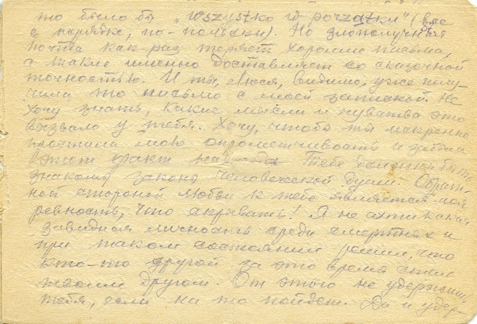 Милая Люся, только что получил твоё второе письмо за время нашей разлуки. В письме – миниатюрная фотокарточка. Это твоё письмо так пристыдило мою совесть, что я прошу простить мне за моё предыдущее письмо. Жизнь и проста, и вместе с тем крайне сложна и запутанна. В данном случае я поступил глупо, по-детски, погорячился. Люся, ты прости мне это. Пойми, как я ждал твои письма! И только через 4 месяца пришло первое письмо твоё! Руки дрожали, кружилась голова, когда я взял конверт со знакомым почерком. Но письмо было крайне кратким, а содержанием его я был страшно обижен. В том письме ты писала, что нашла, наконец, свободную минутку, чтобы написать мне. Как будто бы для меня у тебя нет времени! Мне вспомнилось тогда прошлое, когда ты при моих приездах всегда устремлялась из дому скорее на занятия. Подсознание мне сказало: все это мираж, бессмысленная затея, Люся никогда не интересовалась тобой, а ясно подчеркивала своё безразличие. Я еще не знаю, насколько ты способна к тонкостям поведения, но решил, что ты, получив за 4 месяца уйму моих писем, все же решилась 1 раз ответить. Ответ был крайне безразличным: несколько эпизодов из своих будней. Я обиделся и отослал то письмо твоё тебе обратно с резкой запиской. Вот сам факт. Если бы оно затерялось, то было бы всё в порядке (написано на польском). Но злополучная почта как раз теряет хорошие письма, а такие именно доставляет со сказочной точностью. И ты, Люся, видимо, уже получило то письмо с моей запиской. Не хочу знать, какие мысли и чувства это вызвало у тебя, хочу чтобы ты искренно простила мою опрометчивость и забыла этот факт навсегда. Тебе должно быть, знакомы законы человеческой души. Обратной стороной любви к тебе является моя ревность, что скрывать! Я не ахти какая завидная личность среди смертных и при таком состоянии решил, что кто-то другой за это время стал тебе другом. От этого не удержишь тебя, если на то пойдет. Да и удерживать бессмысленно. Наша дружба и любовь друг к другу, как и у всех людей, может быть прочной и долговечной, лишь на основе окончательного и бесповоротного решения принадлежать и быть навсегда только я для тебя, а ты для меня. Это решение мы должны подкреплять всякий раз, как только возникает возможность изменить друг другу, максимальным напряжением всех усилий воли не поддаваться никаким даже небесным, сказочным искусителям. В этом, по моему, вся тайна столь редкой в наше время преданности до конца супругов. Как только мы окажемся безвольными, тотчас попадем на удочку греха. Я говорю «Супругов» вполне уместно, так как я, однажды полюбив тебя, дал себе слово жениться и быть верным тебе, Люся, мужем. Об этом я писал тебе сразу, только иными словами. Тогда еще в Чебаркуле ты мне ответила, что вопросы любви и брака ты не желаешь решать через письма и намекнула, что это дело вообще преждевременно! При встречах я не навязывал этой темы. Так мы и расстались, полузнакомыми. Теперь, в далеке мне не хочется заниматься банальной перепиской с тобой или с другими девушками. Хочу писать, кроме родных, лишь тебе одной, и только как своей, нареченной, будущей жене. Больше говорить мне нечего. Если ты, Люся, готова к этому, то прости мой ошибочный шаг, который я сделал, возвратив твоё предыдущее письмо тебе обратно. Из сегодняшнего твоего письма ясно, что то было не первое письмо за четыре месяца от тебя. 