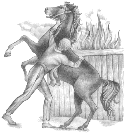 Він швидко скинув із себе шалик, акуратно накинув його мені на очі й, погладжуючи та плескаючи мене по боках, вивів з охопленої полум’ям стайні. Коли я був у безпеці, Джеймс скинув з мене шалика і крикнув: