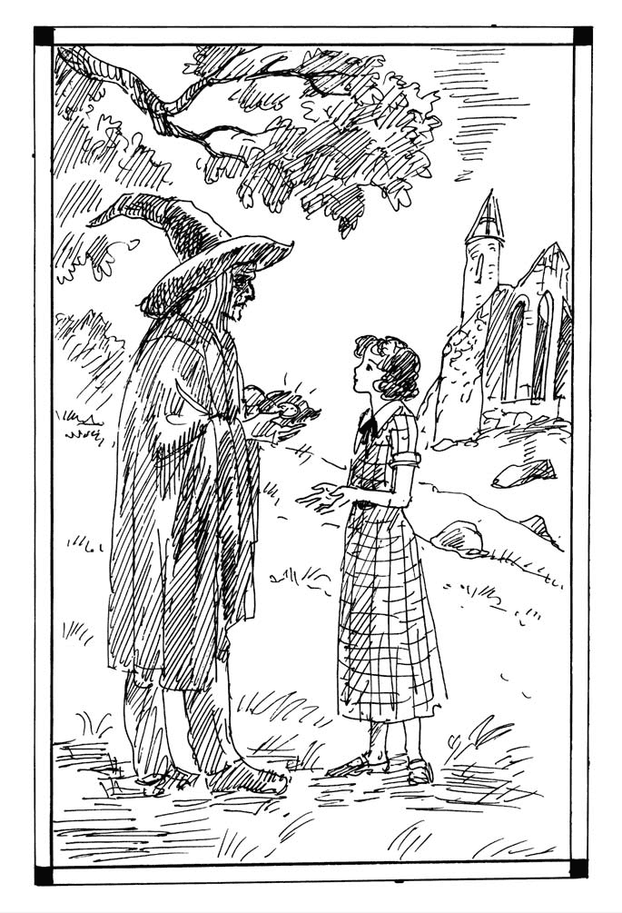 Сделав паузу, он сдернул шляпу и изящно поклонился девочке, которая стояла перед ним. Возобновив свой рассказ, он несколько раз указал в направлении замка, и я предположила, что он говорит об истории народа, который когда-то жил здесь, о вождях и героях, которые прославили эту страну. Потом старик умолк и глубоко вздохнул. У него над головой мягко покачивались темные листья, а торчащие ветки чуть не задевали его шляпу.