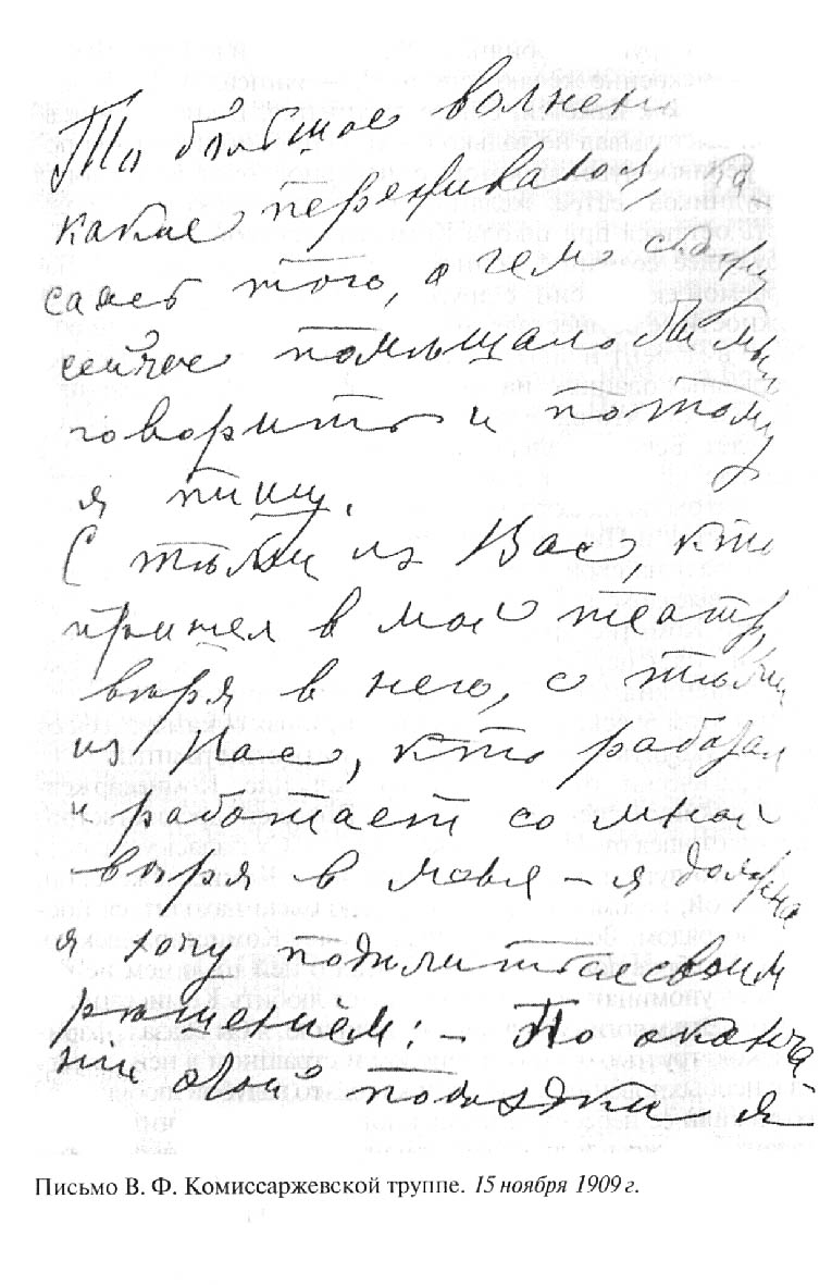 Комиссаржевская В. Ф. Письмо труппе театра, 15 ноября 1909 г. // Комиссаржевская В. Ф. Письма актрисы. Воспоминания о ней. Материалы. С. 177.