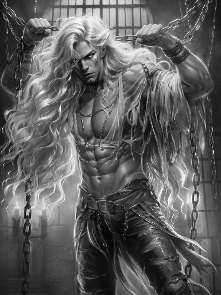 И вот последняя ступенька. Пламя факела осветило лицо мужчины, зажатое между ржавыми железными прутьями. Его безумный оскал и адский огонь в глазах. Его взлохмаченные волосы, в которых запутались солома и паутина. Гладкую мускулистую грудь, до синяков вмятую в тюремную решетку. Одежда на узнике сгнила и превратилась в лохмотья. Теневир был практически голый.