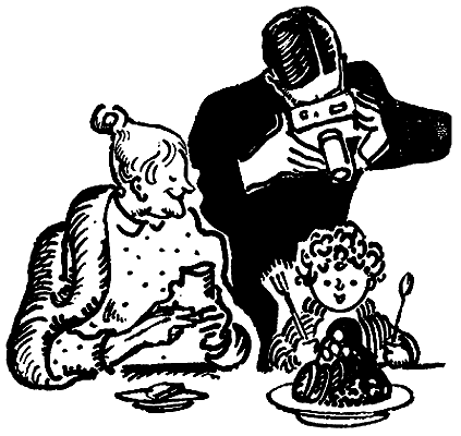 Всем хотелось, чтобы необычные гости пошли к столу первыми, поэтому Мортен взял бабушку за руку и повёл её в столовую. Но на пороге столовой он остановился как вкопанный. Никогда в жизни Мортен не видел такого большого стола, и весь этот длиннющий стол был завален едой. Блюда, вазы, салатницы, селёдочницы, соусницы – и всюду еда, еда, еда…