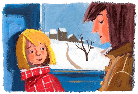 Вскоре к перрону подошёл поезд, и Гюро с мамой стали искать свободные места. Им посчастливилось найти два местечка у окна. Они сидели друг против друга и могли сколько угодно смотреть в окно. Постепенно мысли Гюро переключились на то, что она видела за окном. Вон стоит один дом, рядом – другой, и во всех домах живут люди. Интересно, как они выглядят? За домами начинались заснеженные поля. Потом поля сменил лес, и, наверно, в лесу стоял лось. Только бы он не вздумал выйти на рельсы, ведь он может попасть под поезд. Но вот лес кончился, и поезд остановился у новой станции. На платформе было много людей, они все собирались куда-то ехать. Может, кто-нибудь сядет и в их купе? Когда папа Гюро был болен, он однажды сказал: