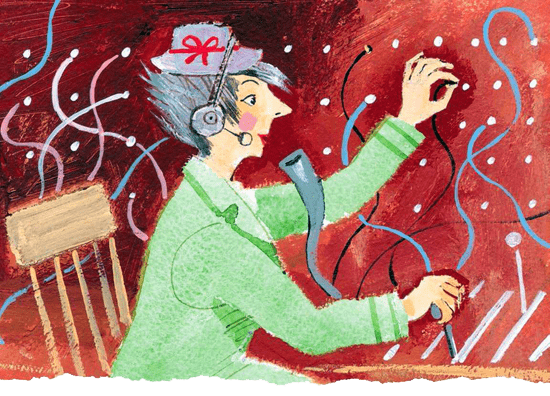 Там на выстроенных в ряд стульях сидело много-много людей. Они все разговаривали, но, к удивлению Гюро, не друг с другом, а как будто сами с собой или по телефону, хотя никакой трубки в руках у них не было. Выглядели они странно – на ушах у них были наушники, над головой висела изогнутая трубка, а перед ртом находился маленький шарик, в который они и говорили. Они нажимали на кнопки, вытаскивали или вставляли пробки, к которым были прикреплены длинные провода, и писали что-то на карточках. Но когда Гюро пригляделась, это оказались не слова, а только чёрточки.