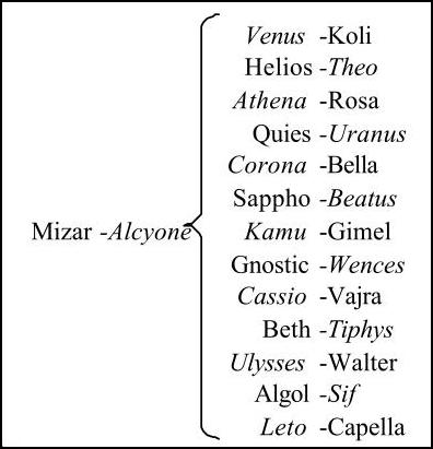Мицар и Алкиона определённо заслужили благословение, ибо у них было 13 детей (см. илл. 7) в дополнение к тем двум, отцом которых был Дхрува. Когда король Рама умер, на трон взошёл брат Алкионы Вирадж – старший из семи братьев. Остальные шестеро исполняли работу либо губернаторов провинций, либо разъездных ревизоров, согласно схеме, разработанной ещё Марсом. К этому времени присоединились ещё несколько отдалённых провинций, система пограничной охраны была усовершенствована, так что вторая половина жизни Алкионы была временем мира и прогресса в том, что касается страны. Как обычно, Алкиона дожила до глубокой старости и скончалась в возрасте 89 лет.