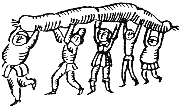 С громкими криками и шумом предали они ее в тот же день смерти. Мясо, сало, щетину и ножки судьям за хлопоты отдали. А чтобы ничего не пропадало даром, промыли кишки, набили их всем, чем положено, и сделали одну огромную колбасу. Но тут пришлось им покумекать: в чем же ее сварить?