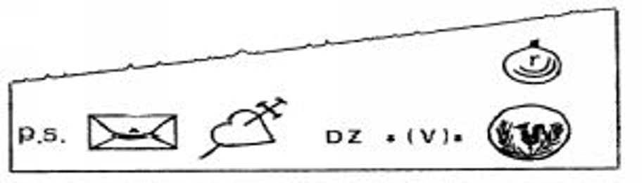 Посмотрите на подпись: шар с буквой «R» внутри означает Буле-Руж. Это печать главаря банды, который показал себя более ловким, чем вся полиция. Знак конверта означает: напишите. Проколотое кинжалом сердце является знаком моего старого клиента Жюля Лансеньи, которого звали в банде Пети-Пуаньяр. «DZ». Банда зашифровала буквы алфавита цифрами, а цифры буквами. Четвертая буква по порядку – «D», соответственно это – 4. «Z» – последняя буква алфавита означает «0». Таким образом, получается «40». Две скобки между двумя точками обозначают некую улицу Парижа. Преступники каталогизировали всю столицу. Каждая улица, каждый проезд, площадь получили свой определенный символ. Круглые скобки – знак улицы, буква внутри – название. Итак, что же означает начальная буква «V»? Первое, что пришло мне в голову, это улица Вожирар. Мое предположение оказалось правильным. Теперь последний знак в правом нижнем углу: Эта монета[13] доставила мне гораздо больше проблем, и я очень долго раздумывал над ней. После миллиона проб и ошибок, меня, наконец, осенило то, о чем я должен был подумать с самого начала, она означала имя «Луи». Итак, вот фрагмент целиком:
