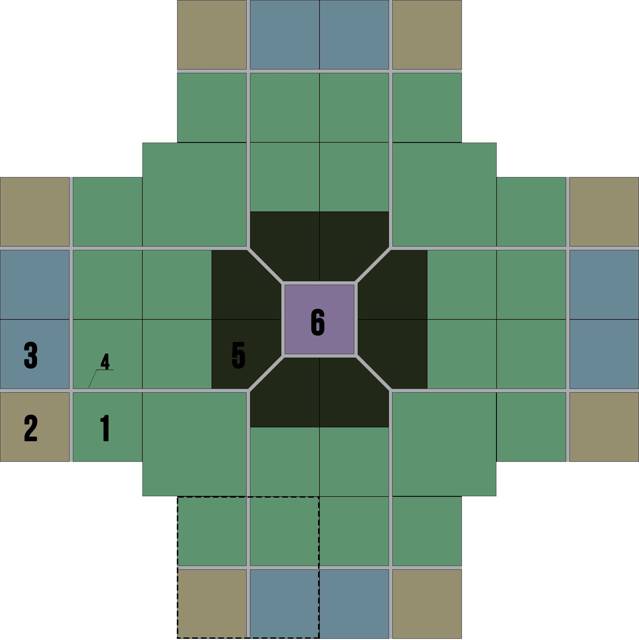 (Планируемая схема города, в перспективе один из жилых районов. 1.– жилой микрорайон, 2.– промышленный микрорайон, 3.– коммерческий микрорайон, 4.– магистральные дороги, 5.– зона центрального лесопарка, 6. – административный центр города/района. Пунктиром выделены заложенные на данный момент кубы)