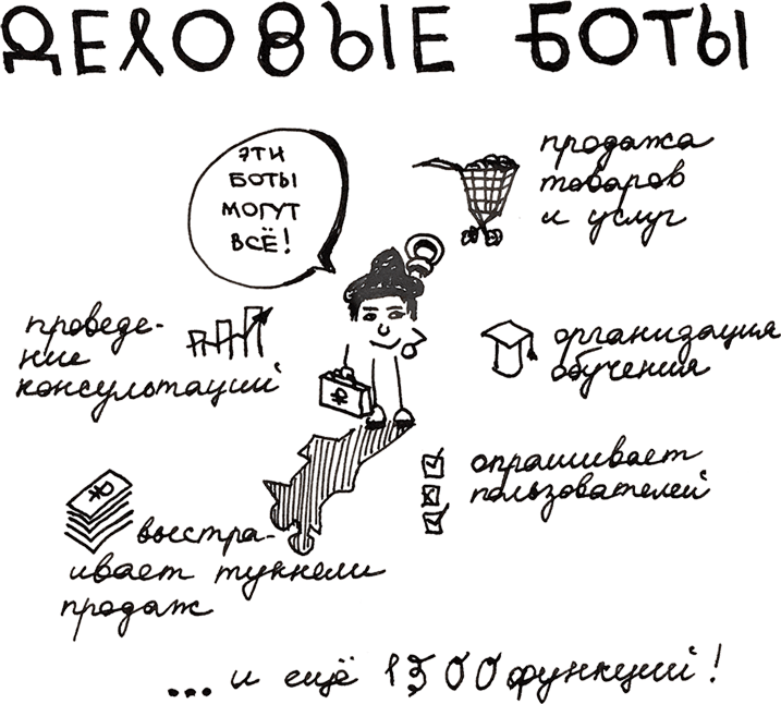 Деловые боты, выполняют огромное множество задач от продажи услуг до обучения подписчиков.