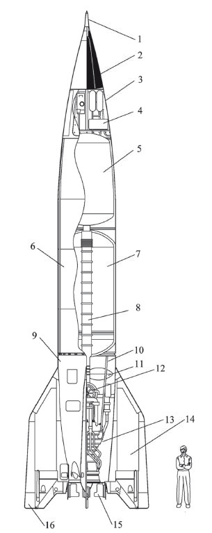 3 – приборный отсек; 4 – приборы системы управления; 5 – бак горючего; 6 – топливный отсек; 7 – бак окислителя; 8 – тоннель трубопровода горючего; 9 – хвостовой отсек; 10 – рама ракетного двигателя; 11 – бак перекиси водорода; 12 – турбонасосный агрегат; 13 – камера сгорания и сопло; 14 – стабилизаторы; 15 – газовые рули; 16 – воздушные рули