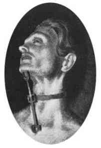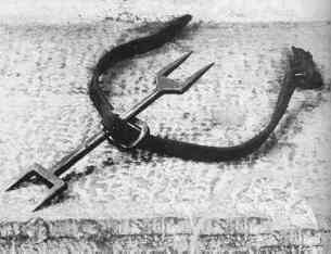 Четырехзубая, двусторонняя вилка применялась при допросах как показано на рисунке. Глубоко проникая в плоть она причиняла боль при любой попытке пошевелить головой и позволяла говорить допрашиваемому только неразборчивым, еле слышным голосом. На вилке было выгравировано: «Я отрекаюсь».