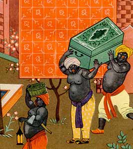 Рисунок их арабской миниатюры – трое евнухов несут сундук (обратите внимание на их женоподобные фигуры).