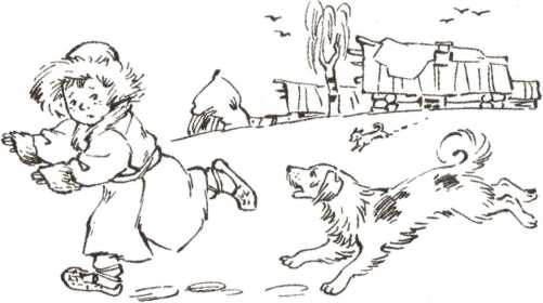 Школа была за селом у церкви. Когда Филипок шёл по своей слободе, собаки не трогали его, они его знали. Но когда он вышел к чужим дворам, выскочила Жучка, залаяла, а за Жучкой большая собака Волчок. Филипок бросился бежать, собаки за ним. Филипок стал кричать, споткнулся и упал. Вышел мужик, отогнал собак и сказал: